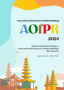 Download: AOfPR Issue 9 2024 Organizing Committee & Table of Content Foreword & Committee Members Top 5 e-poster Top 5 oral presentations Download: AOfPR Issue 8 2023 AOfPR 2023 content page AOfPR Editorial 2023 Silver award Oral Gold award poster Silver award poster Bronze award poster Download: AOfPR Issue 7 Aug 2023 Editorial – from the Guest Editors AOSPR 2022 in Review – Unifying Pediatric Clinical Imaging Practice Across Asia and Oceania Chest Ultrasound in Detecting Pediatric TB Mediastinal Lymphadenopathy Pulmonary Imaging Findings in Pediatric COVID-19 Clinical Utility of the DWI ratio in Pediatric Primary Brain Neoplasms Diagnostic Challenges in Pediatric Presacral Tumors AOSPR 2022 Winning Poster – Association between Germinal Matrix Hemorrhage and Perinatal Factors Multi-modality Approach to an Adolescent Scrotal AVM Intrathoracic Renal Ectopia with Congenital Diaphragmatic Hernia Neonate with Multiple Cardiac Masses Pediatric Radiology Quiz Challenge – An Educational Activity for AOSPR 2022 Pediatric Radiology Journey of Northern Mindanao Download: AOfPR Issue 6 Nov 2020 Yeon Jin Cho Gold Joanna M Choa Silver Blaise Jones Bronz Jisum Hwang Gold Pyeong Hwa Kim Gold Seonghwan Byun Silver Stephen Simoneaux Bronz Haesung Yoon Bronze Gayoung Choi Bronze Download: AOfPR Issue 5 Oct 2018 AOfPR Issue 4 April 2017Complete AOfPR issue 4Shunsuke Nosaka – Welcome letter from the editorMasahiro Kitami – Genitourinary Pediatric Ultrasonography: Basic Techniques, Tips and Pitfalls.Osamu Miyazaki – ABCs of Pediatric CT radiation: Recommended reading for pediatric radiology residents.Kono, Fujita, Nishimura – Superb Micro-vascular Imaging (SMI): Clinical Advantages of a Novel US Flow Technique in Pediatric Diagnostic Imaging.Atsuko Fujikawa et al. – Prompt Computed Tomography and Direct Transcatheter Angioembolization in Abdominal Blunt Trauma in Pediatrics: A Case Report.Michael P. D’Alessandro – Free Mobile Apps to Help Learning While Working in Pediatrics and Pediatric Radiology. Download: AOfPR Issue 3 July 2016 Download: AOfPR Issue 2 February 2016 Download: AOfPR Issue 1 October 2015